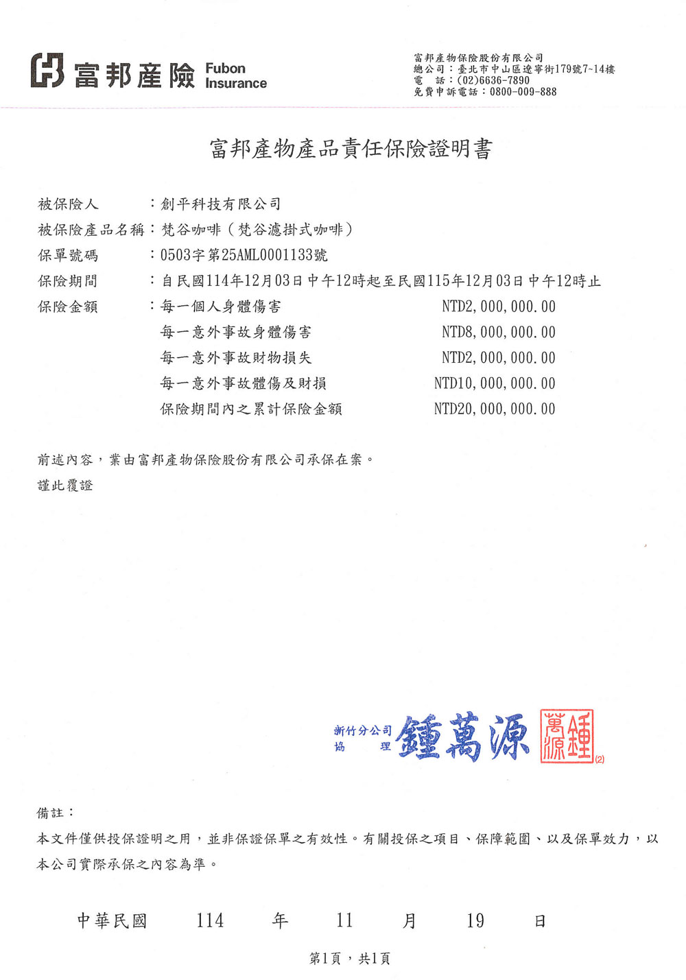 被保險產品名稱:梵谷咖啡(梵谷濾掛式咖啡)